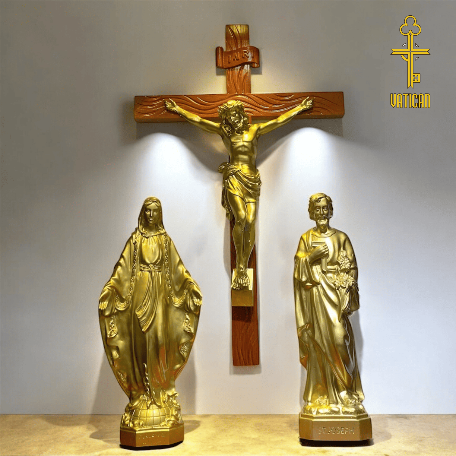 Bộ tượng 3 Đấng 60cm, Thánh giá gỗ 90cm – Đồ Đồng Công Giáo Vatican