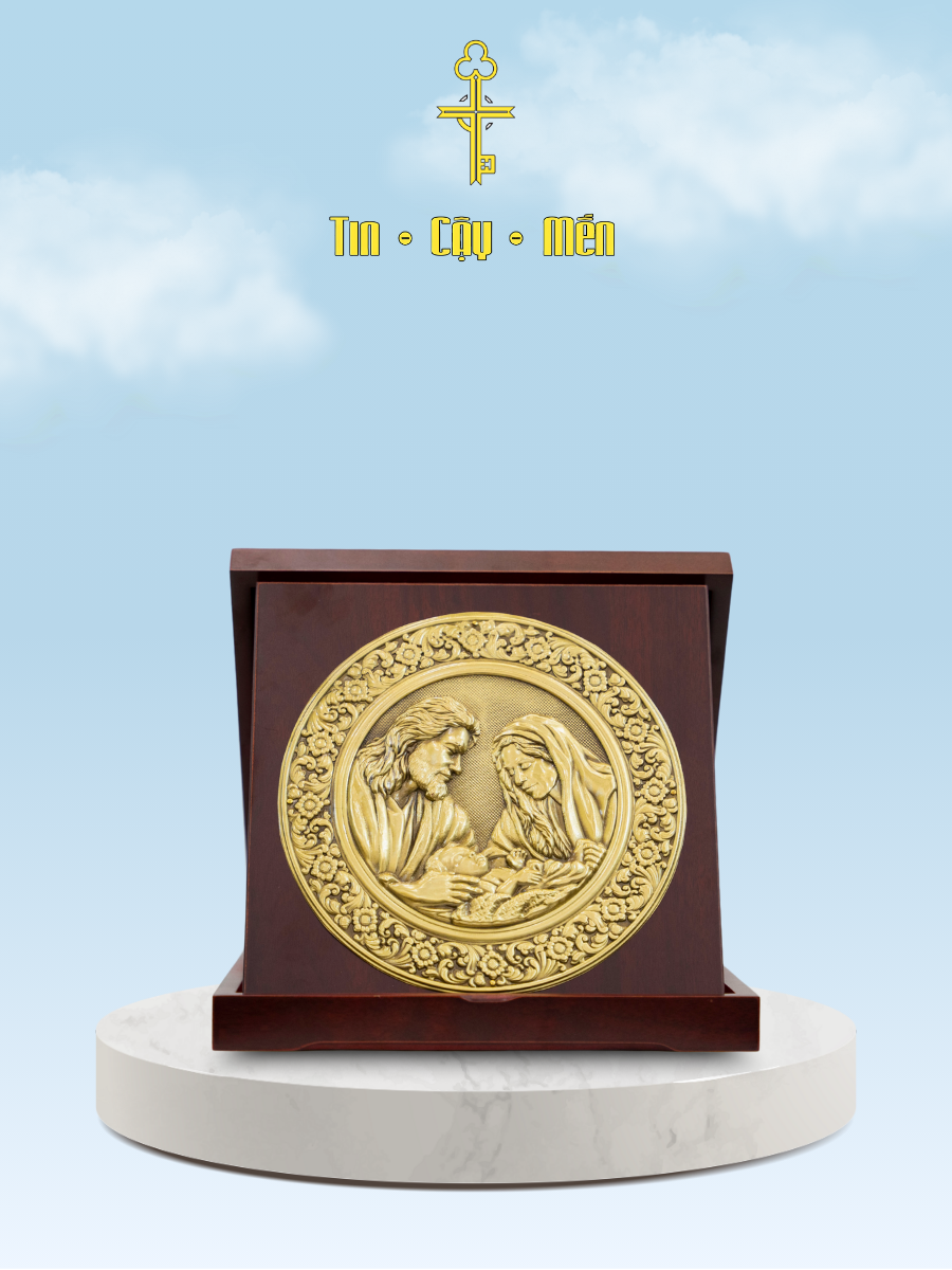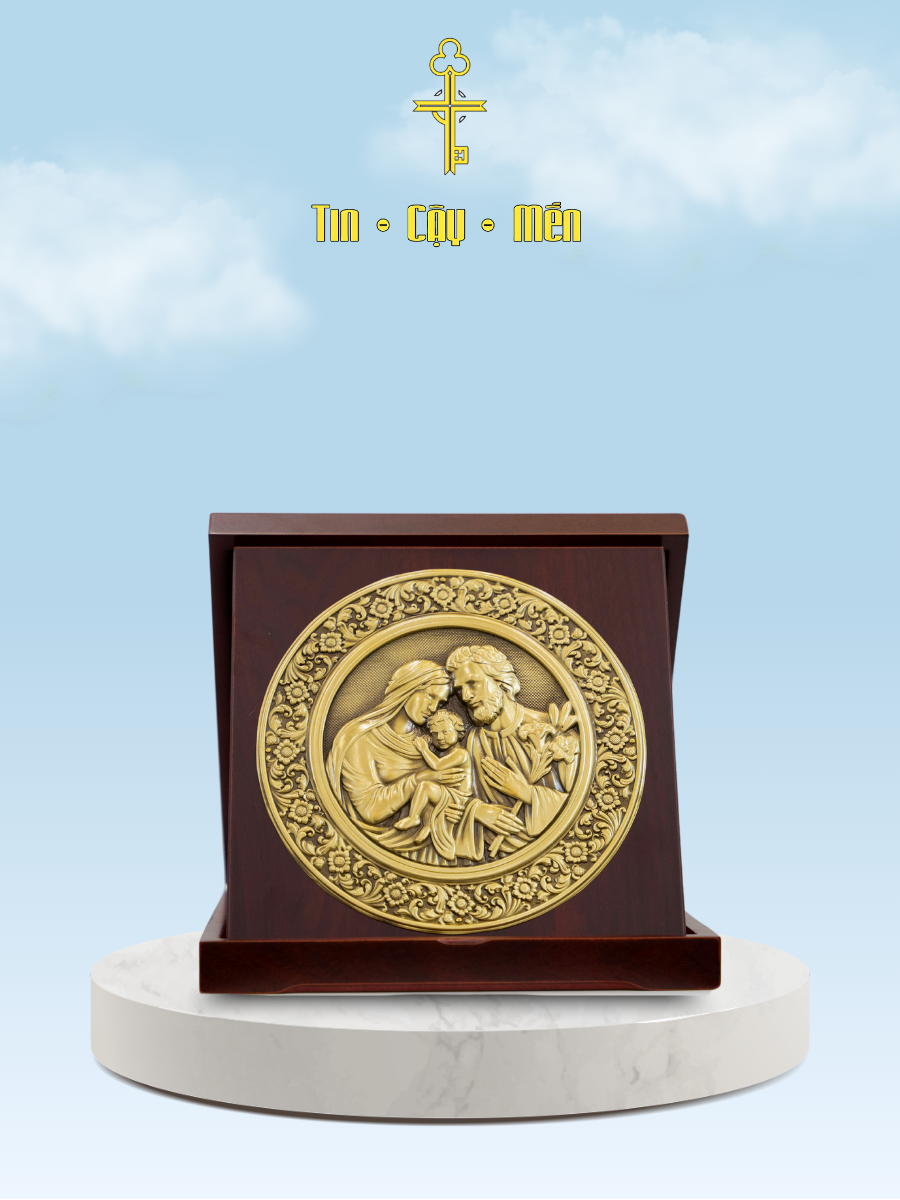 Hộp Vuông Gia Đình Thánh Gia đồng vàng mẫu 03 (ĐK 18, hộp 23×23) – Sang trọng, ý nghĩa