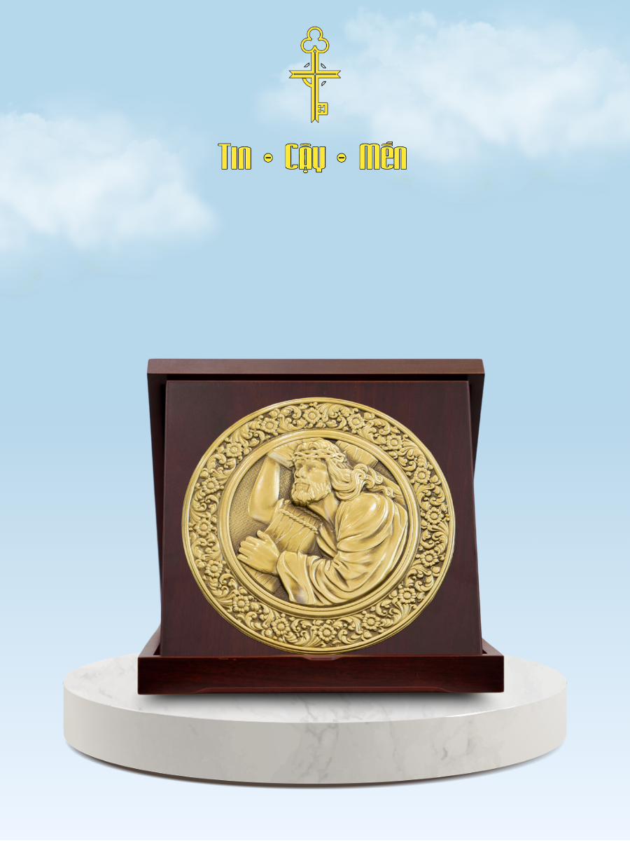 Hộp Vuông Chúa Giê-su Vác Thánh Giá Đồng Vàng (23×23) – Sản phẩm cao cấp