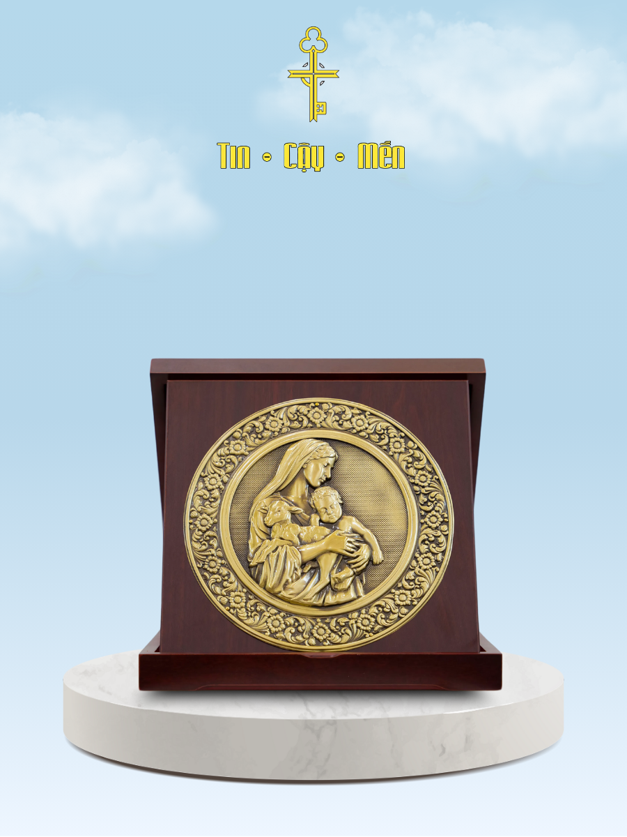 Hộp Vuông Đức Mẹ Bế Chúa Hài Đồng Đồng Vàng (23×23) – Mẫu 01 Cao Cấp