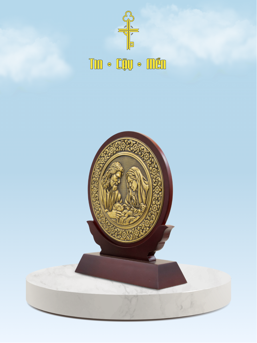 Đế Gỗ Tròn Gia Đình Thánh Gia mẫu 02 (20x25cm) là sản phẩm tâm linh cao cấp được chế tác thủ công từ chất liệu đồng vàng, đồng đỏ sáng bóng kết hợp với đế gỗ tròn chắc chắn.