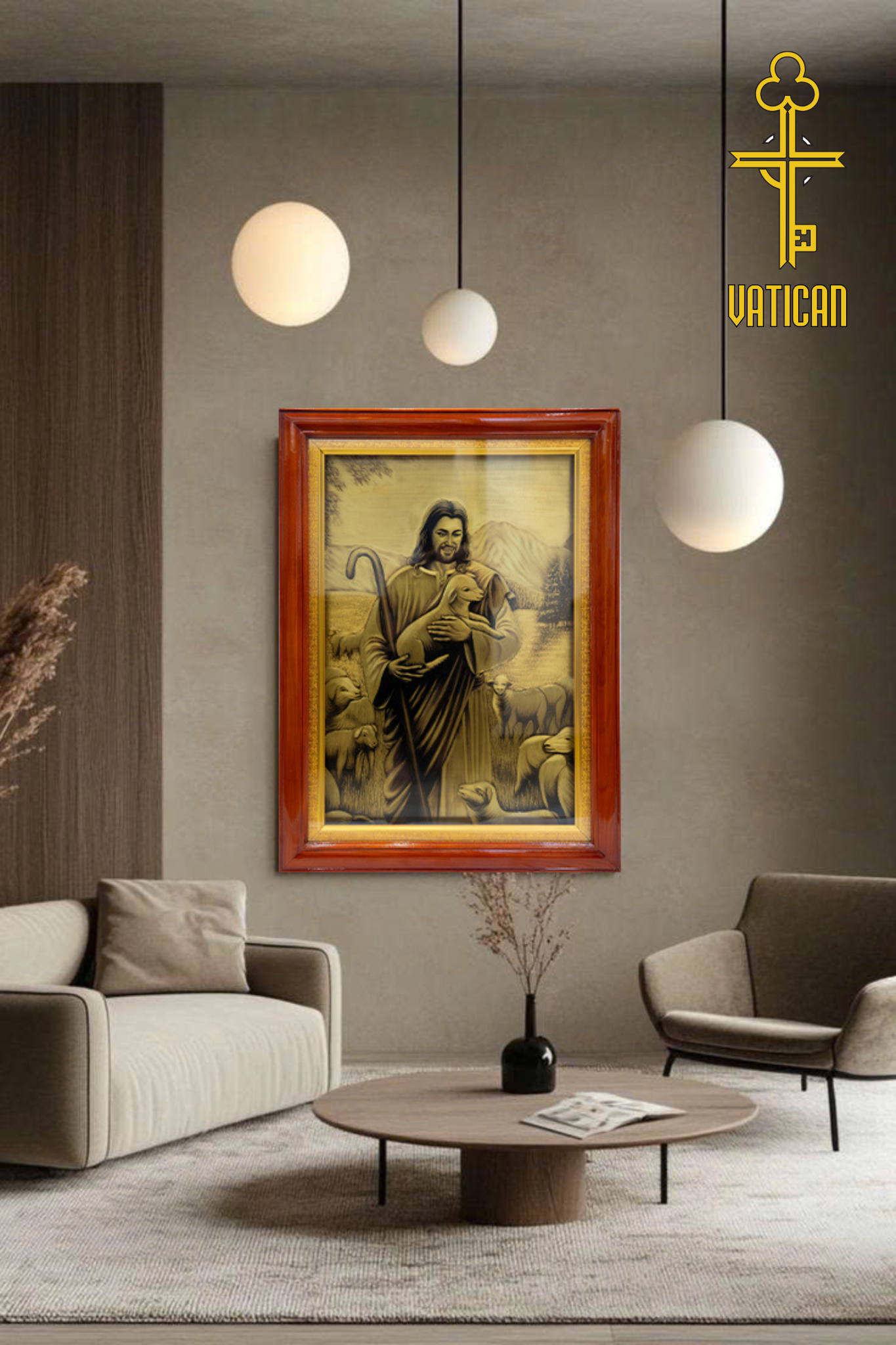 Bức tranh được chế tác tỉ mỉ với hình ảnh Chúa Giê-su ôm chiên hiền từ, tượng trưng cho sự dẫn dắt và bảo vệ đàn chiên của Ngài.