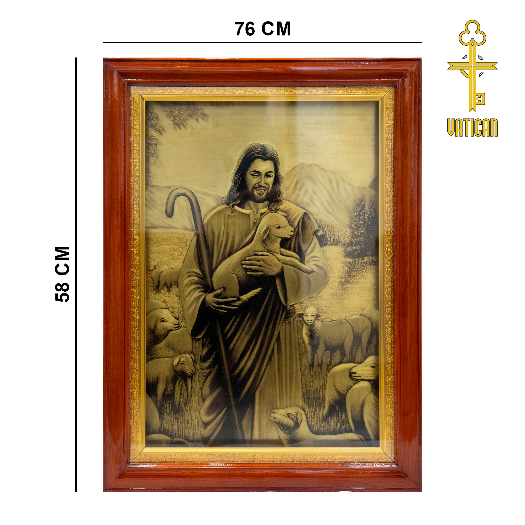 Tranh Chúa Chiên Lành 58×78 khung màu cánh gián là sản phẩm độc quyền của Đồ Đồng Công Giáo Vatican.