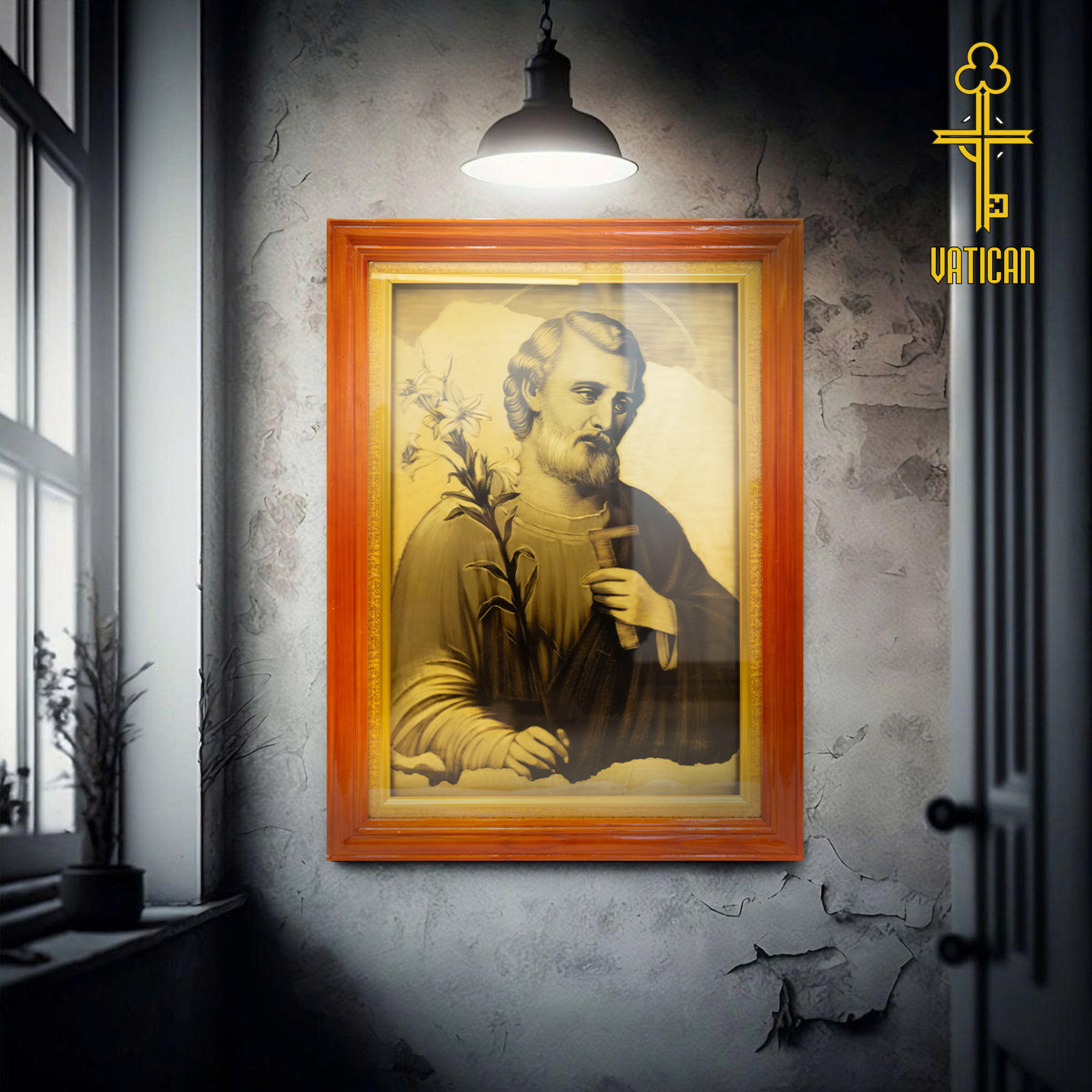 Tranh Thánh Giuse hun xước 58×78 khung sồi trơn màu cánh gián là tác phẩm nghệ thuật độc đáo, kết hợp tinh hoa thủ công và giá trị tâm linh sâu sắc.