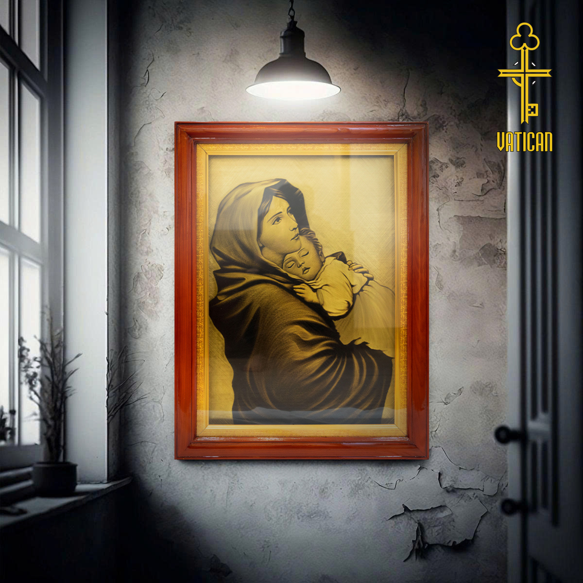 Kích thước 58×78 cm vừa vặn, phù hợp để treo tại phòng khách, phòng thờ, nhà nguyện hoặc văn phòng tôn giáo.