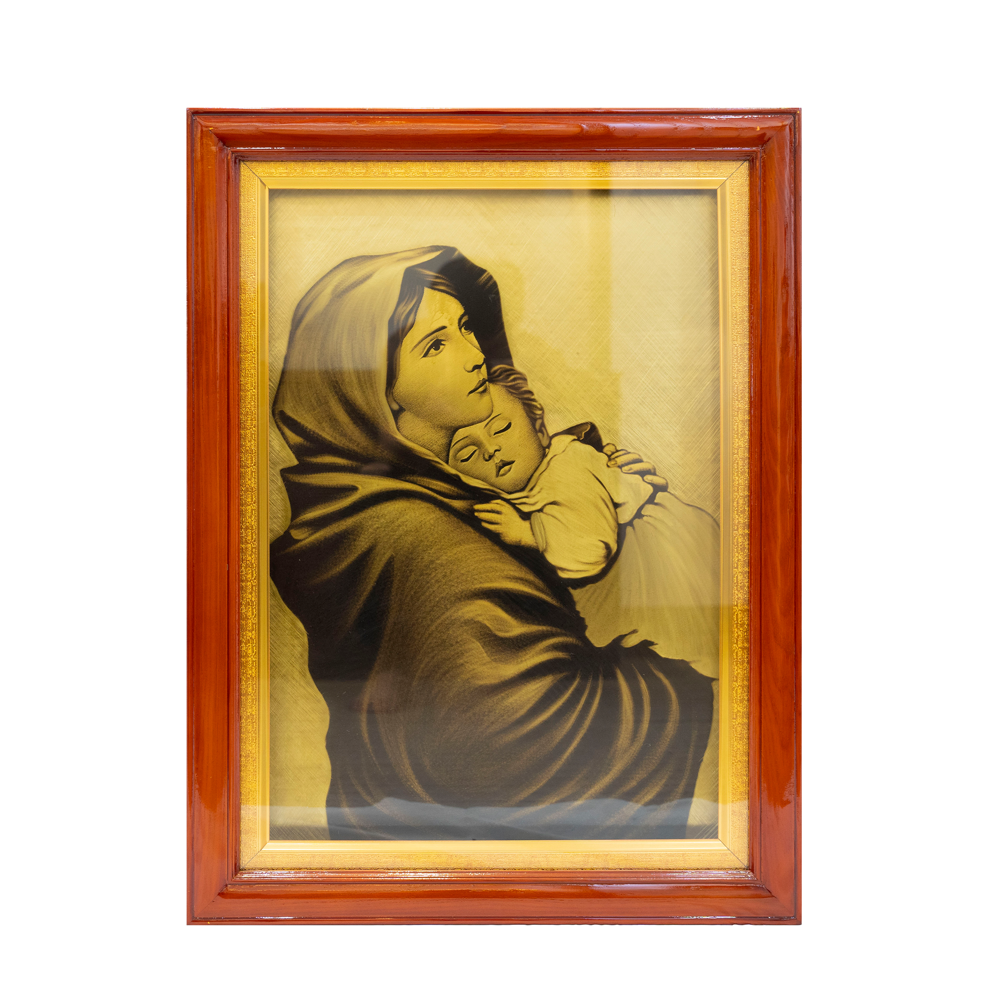 Tranh Xước Mẹ Thiên Chúa Bồng Con 58×78 Khung Gỗ Gõ là sự kết hợp hoàn hảo giữa nghệ thuật chế tác đồng thủ công và giá trị tâm linh.