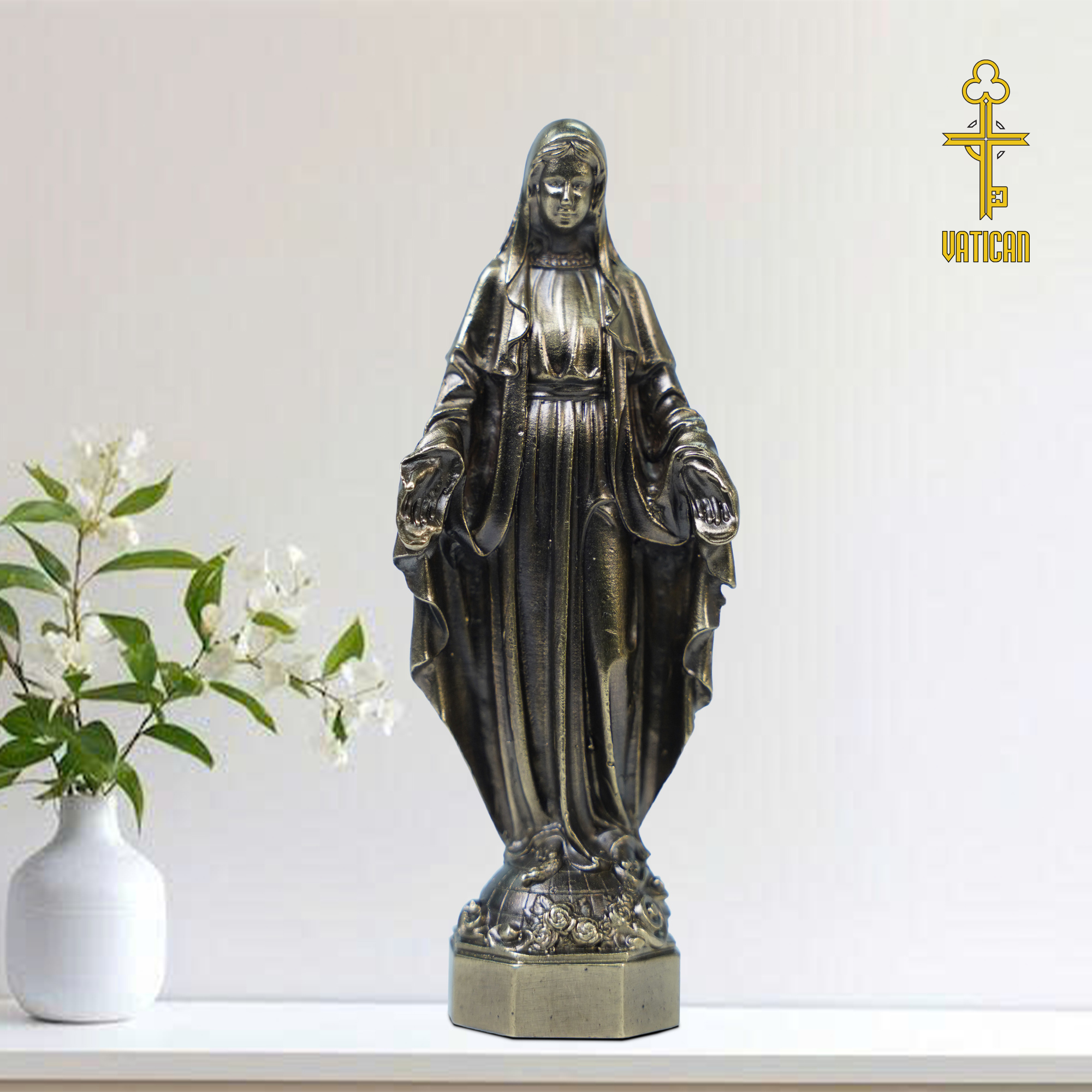 Tượng Đức Mẹ Ban Ơn cao 15cm là một trong những sản phẩm nổi bật của Đồ Đồng Công Giáo Vatican. Sản phẩm được chế tác từ đồng vàng cao cấp, đúc thủ công nguyên khối bởi những nghệ nhân có tay nghề lâu năm. Từng đường nét, chi tiết trên tượng đều được chạm khắc tinh xảo, thể hiện sự tôn kính và lòng thành dâng lên Đức Mẹ. Với kích thước cao 15 cm, tượng có thể đặt trên bàn thờ gia đình, phòng khách hoặc làm quà tặng ý nghĩa trong các dịp đặc biệt.