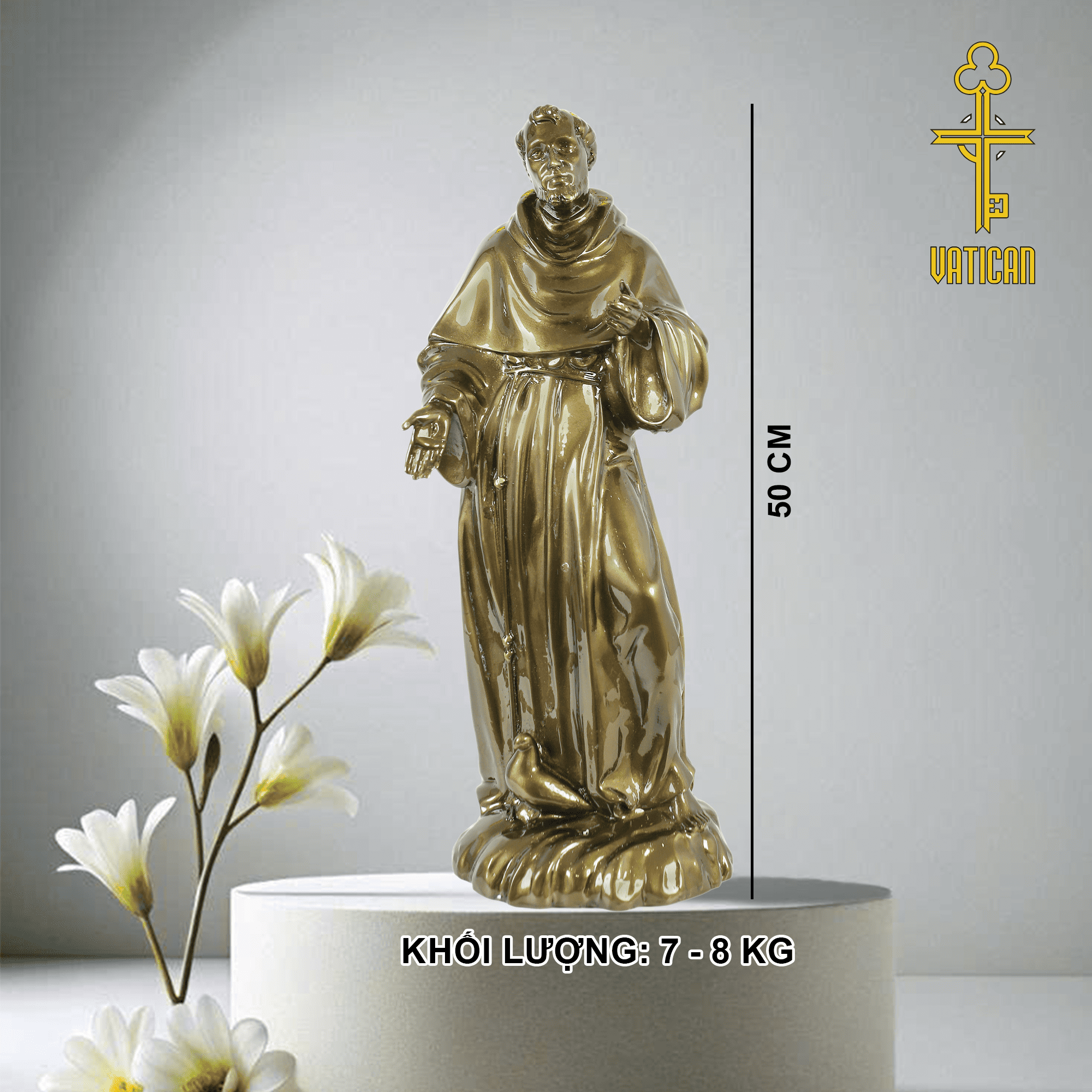 Thánh Phanxico là vị thánh biểu tượng cho đức khiêm nhường, lòng bác ái và tình yêu thiên nhiên. Tượng Thánh Phanxico cao 50cm màu hun giả cổ không chỉ mang giá trị thẩm mỹ mà còn nhắc nhở người chiêm ngắm về đời sống giản dị, tinh thần hướng thiện.